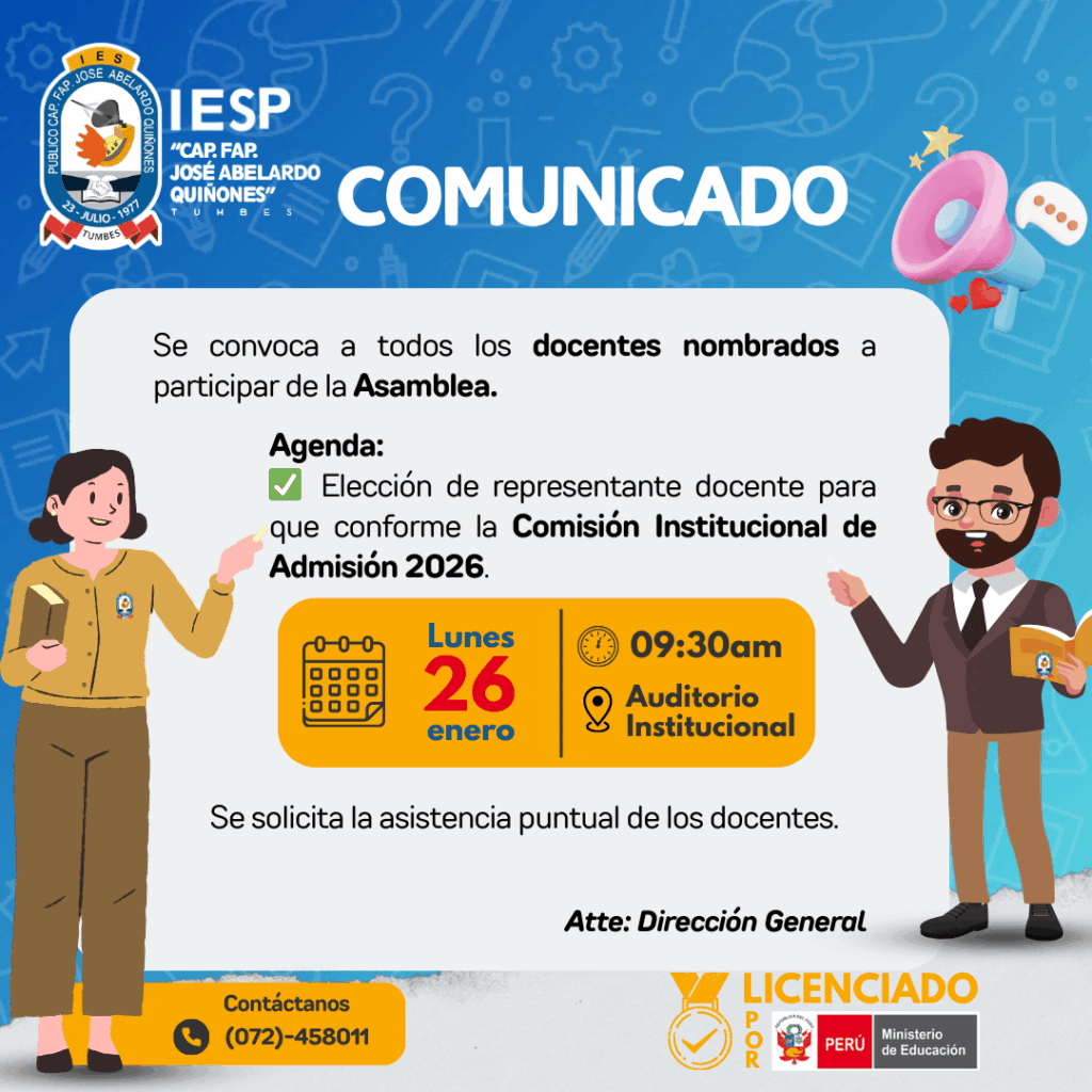En esta sección, podrás mantenerte informado sobre los últimos comunicados emitidos por nuestra institución educativa. Somos el IES Público «CAP. FAP. José Abelardo Quiñones» de Tumbes, una Institución de Educación Superior (IES) comprometida con la excelencia académica y el desarrollo integral de nuestros estudiantes.
