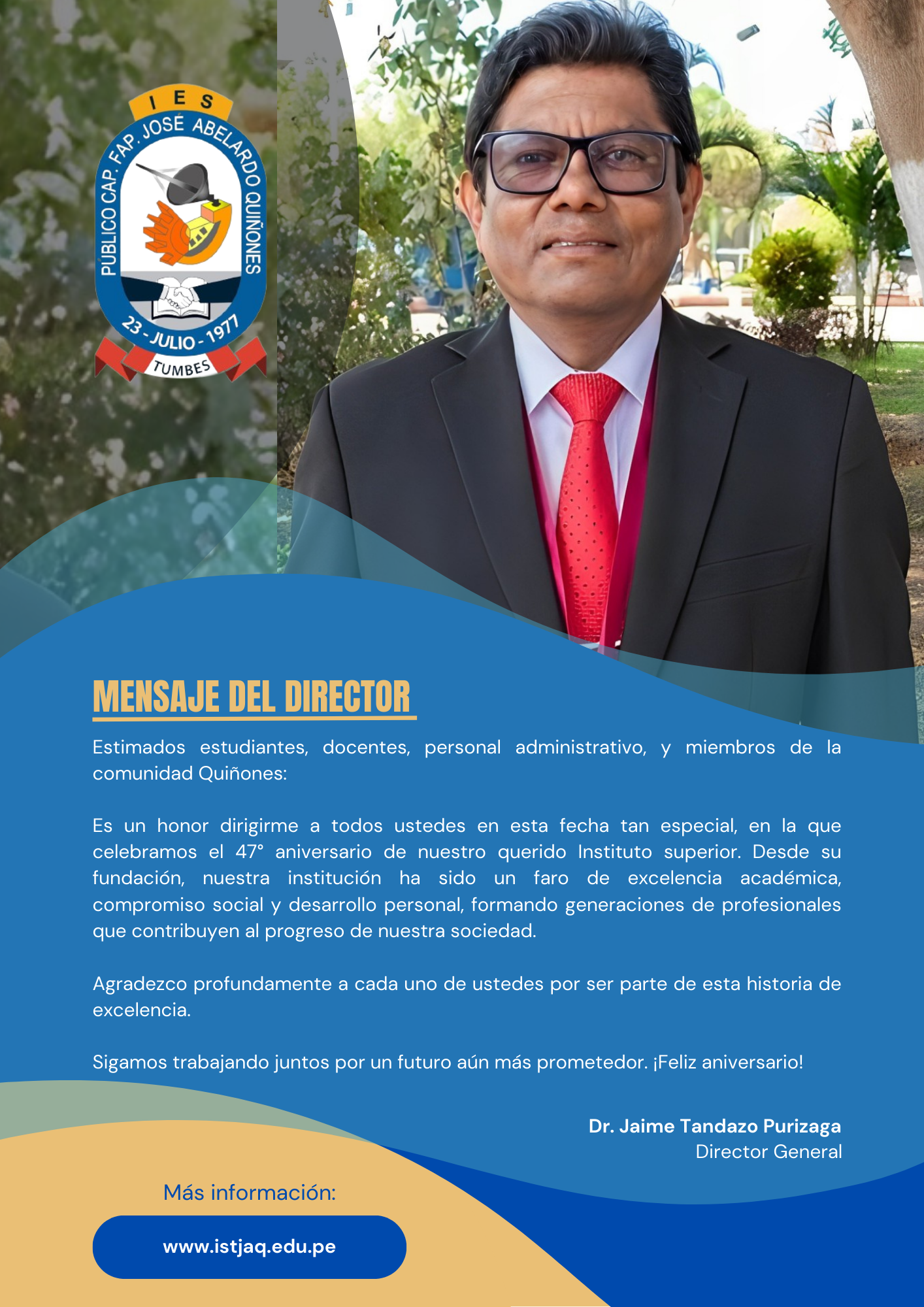 Hoy celebramos con orgullo el 47° aniversario de nuestro IES. Han sido años de esfuerzo, dedicación y logros compartidos por estudiantes, docentes y personal administrativo. Agradecemos profundamente a cada uno de ustedes por ser parte de esta historia de excelencia.